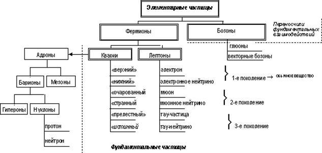 Существует несколько групп элементарных частиц, различающихся по своим свойствам и характеру взаимодействия, которые принято делить на две большие группы: фермионы и бозоны (см. рисунок).