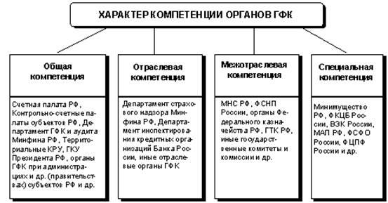 Государственный вневедомственный финансовый контроль осуществляется следующими контрольными органами: Счетной палатой РФ и контрольно-счетными органами субъектов РФ, Главным контрольным управлением Президента РФ, Департаментом государственного финансового контроля (ДГФК) Минфина России, Главным управлением федерального казначейства (ГУФК) Минфина России, Центральным банком РФ, Министерством РФ по налогам и сборам, Государственным таможенным комитетом РФ, Федеральной службой налоговой полиции РФ и государственными внебюджетными фондами — Пенсионным фондом РФ (ПФ РФ), Фондом социального страхования РФ (ФСС РФ), Федеральным и территориальными фондами обязательного медицинского страхования (ФФОМС и ТФОМС).