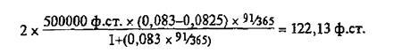 Кроме того, ему возвращается 1500 ф. ст. начальной маржи. В соответствии с полученной котировочной ставкой стерлинговый депозит, на который покупатель переводит деньги, должен принести ему доходность 8, 3%. Однако реальная ставка в выбранном банке может отличаться от данной величины. Допустим, она составляет 8, 25%. Тогда покупатель должен получить от продавца дополнительную сумму денег, чтобы доходность на его инвестиции равнялась 8, 3%. Данная сумма определяется по формуле: