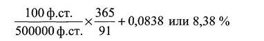 Биржа определяет для контрактов шаг цены, то есть минимальный размер ее изменения, например, один базисный пункт. Допустим, что в основе контракта лежит финансовый инструмент, выписанный на 91 день, номиналом 100000 ф. ст. Шаг цены равен одному базисному пункту, тогда цена шага, то есть его размер в денежном выражении, будет равна: