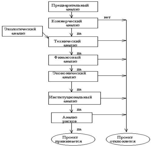 Несмотря на разнообразие проектов их анализ обычно следует некоторой общей схеме, которая включает специальные разделы, оценивающие коммерческую, техническую, финансовую, экономическую и институциональную выполнимость проекта. Добропорядочный, с точки зрения стратегического инвестора, проект должен оканчиваться анализом риска. На рисунке 2 представлена общая последовательность анализа проекта [10, с. 26].