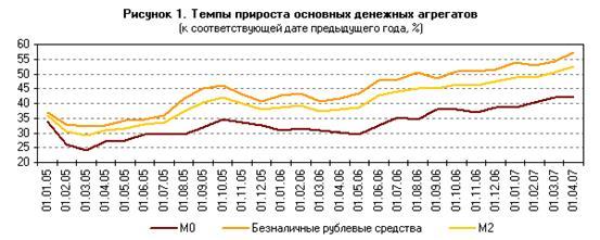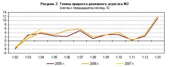 В I квартале 2007 г. темпы прироста денежного агрегата М2 оставались высокими. За январь—март рублевая денежная масса возросла на 4,6% (в I квартале 2006 г. — на 2,0%).