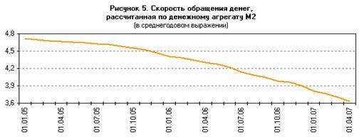 Скорость обращения денег, рассчитанная по денежному агрегату М2 в среднегодовом выражении, снизилась за I квартал 2007 г. на 4,8% (за аналогичный период 2006 г. — на 2,3%). Уровень монетизации экономики (по денежному агрегату М2) увеличился за январь—март 2007 г. с 26,2 до 27,5%.