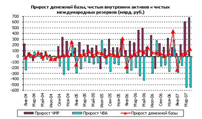 Бюджетная система и Центральный банк внесли примерно равный вклад в снижение ЧМР. Динамика Чистого кредита расширенному правительству была типичной для последнего времени. В составе указанного агрегата наиболее существенные изменения были связаны с движением средств Стабилизационного фонда. Конвертация текущих поступлений обусловила рост ЧМР правительства, и соответственно снижение рублёвого эквивалента. Кроме того, по итогам апреля было зафиксировано увеличение рублевых остатков на счетах федерального бюджета в Банке России, по всей видимости, за счёт средств, подлежащих последующей конвертации и перечислению в Стабилизационный фонд. Рост рублёвых остатков на счетах в Банке России местных органов власти составил порядка 65 млрд. рублей. По итогам первых четырёх месяцев 2007 года снижение ЧВА оценивается в 1538 млрд. рублей. Для сравнения, показатель, характеризующий соответствующий период 2006 года, был равен 1083 млрд. рублей.