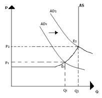 Инфляция спроса возможна на восходящем (промежуточном) и вертикальном (классическом) отрезках кривой совокупного предложения AS. На горизонтальном (кейнсианском) отрезке графика AS, когда существуют низкий уровень использования производственных мощностей и значительная безработица, объем совокупного предложения увеличивается при том же уровне цен. На восходящем отрезке увеличивается как объем совокупного предложения, так и уровень цен. Кривая AS имеет положительный наклон. При достижении полной занятости в экономике реальный объем национального производства не увеличивается при повышении уровня цен.