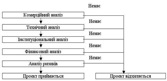 Метою управління капітальними інвестиціями ТОВ «Північноукраїнський будівельний альянс» є вибір найефективніших інвестиційних проектів і забезпечення реалізації окремих інвестиційних програм. Особлива увага приділяється вибору інвестиційних проектів, що здійснюється на основі оцінки їх ефективності при забезпеченні послідовності проведення аналізу. Прийняття або відхилення інвестиційного проекту здійснюється після проведення його аналізу за такої послідовності (рис. 2.2.1).