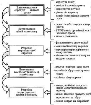 Після ідентифікації зони «продукт — цільова група», визначення обсягів продажу початкового і заключного років функціонування проекту необхідно розробити стратегію маркетингу.