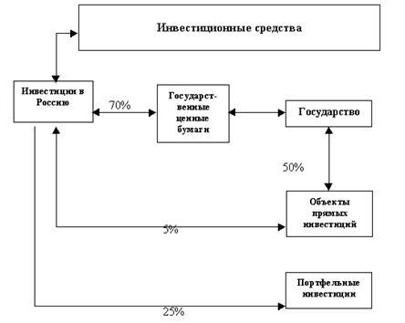 Проанализировав платежный баланс РФ за несколько лет в области инвестиций, можно сделать вывод, что, в зависимости от прогнозируемой экономической ситуации в будущем, поток инвестиций в РФ изменяется как по величине, так и по соотношению между прямыми и портфельными инвестициями. Из этого следует, что большинство инвестиций в РФ являются портфельными, которые при ухудшении ситуации в стране «моментально» «уходят» из России. Внешние инвестиции в Россию можно представить следующей блок – схемой.