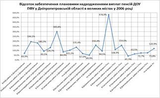 Рис.В.3. Порівняльна таблиця забезпеченості коштами в Пенсійному Фонді України у Дніпропетровській області у 2006 році (великі міста області –порайонно)