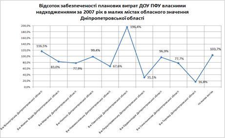 Рис.В.7. Порівняльна таблиця забезпеченості коштами в Пенсійному Фонді України у Дніпропетровській області у 2007 році (малі міста області обласного значення )