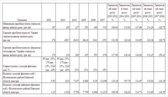 – ланцюгові темпи приросту обсягів податку з доходів фізичних осіб в бюджеті Яготинського району за 2006–2007 роки є вищими та становлять +15,87% у 2006 році відносно рівня 2005 року та +48,2% у 2007 році відносно рівня 2006 року;