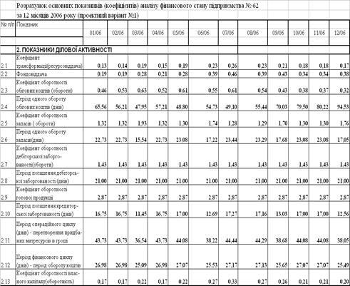 В табл. 2.7-2.11 приведені результати розрахунків основних характеристик діяльності спрогнозованого підприємства № 62 по алгоритму розрахунків, викладеному в розділі 2.1. В таблицях розрахунків одночасно наведені нормативні значення характеристик підприємств [9],[10],[11],[12].