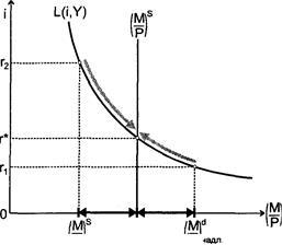 виникає надлишковий попит на гроші, який усувається економічними агентами за допомогою продажу облігацій. Колективний продаж облігацій спричиняє збільшення пропозиції облігацій на ринку і, таким чином, падіння їхньої ринкової ціни. Оскільки зниження ринкової ціни облігацій супроводжується зростанням процентної ставки, то зміна структури портфеля триватиме доти, поки бажаний рівень зберігання грошей не відповідатиме пропозиції грошей при процентній ставці r=r*.