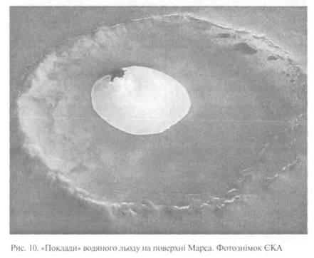 Здавалося, що дослідники вже практично впевнилися - вода з Марса або зовсім випарувалася, або пішла під землю, і, можливо, відбулося це мільйони років тому, а може, й мільярди. Та після липня 2005 р. вченим знову довелося переглянути свої висновки. Саме тоді фахівці з ЄКА повідомили, що на Марсі виявлено замерзлу воду на відкритій поверхні планети (рис. 6). На фотознімку, зробленому з борту КА «Марс-експрес», у високих північних широтах планети був зареєстрований кратер з покладами льоду на дні. Температура й тиск у тому районі такі, що там не може бути твердого двоокису вуглецю - так званого сухого люду.