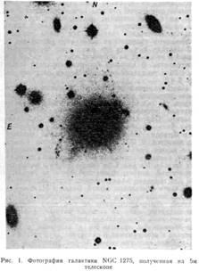 эрг/с, источники пополнения которой до сих пор еще не обнаружены. Спектральные исследования показали, что в ядрах имеются газовые образования, движущиеся со скоростями в десятки тысяч км/с. Как непрерывное, так и линейчатое излучение таких ядер галактик меняется со временем. Причем время переменности иногда достигает очень малых значений: заметные изменения происходят в ядре всего за несколько суток, а иногда даже и за несколько часов. Все эти данные говорят о том, что сейфертовские ядра, а среди них и ядро галактики NGC 1275 — это котлы, где реализуются громадные запасы энергии. Вопрос состоит в том, откуда берется эта энергия.