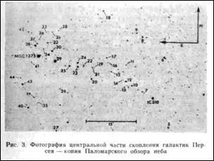 Скопление галактик в Персее — одно из самых богатых ближайших к нам скоплений. На рис. 3 приведена фотография его центральной части. На ней номерами отмечены наиболее яркие члены скопления. Скопление исследовалось во всех диапазонах длин волн от радио до рентгена. В оптической области спектра одними из первых его изучали Хаббл и Хьюмасон.