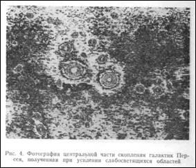 Очень интересные результаты получили Арп и Бертола. Они применили методику, которая позволила обнаружить слабосветящиеся образования одновременно с яркими центральными областями галактик скопления. На их снимках размеры галактик оказались гораздо больше, чем на обычных фотографиях. На рис. 4, заимствованном из их работы, видна центральная часть скопления галактик в Персее.