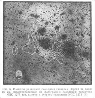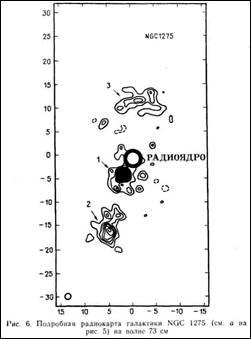 расположена дальше от ядра, имеет меньшую яркость и спектральный индекс ее излучения равен 1,6 (радиоспектр крутой). Отсюда был сделан вывод, что радиоизлучающие облака электронов на юго-востоке содержат в среднем более энергичные электроны, чем облака, расположенные на северо-западе. Как мы видели ранее, первые считаются более молодыми, чем вторые, так как более энергичные электроны высвечиваются быстрее, чем менее энергичные. Все приведенные факты позволяют сделать предположение, что активность ядра галактики NGC 1275 в направлении на юг в последнее время была больше выражена, чем на север.
