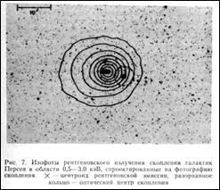 Диапазон наблюдаемых энергий расширился до 53 – 93 кэВ. Улучшалось и угловое разрешение при наблюдениях. На орбитальном телескопе "Коперник" наблюдения велись в области энергий 0,5 – 3,0 кэВ, пространственное разрешение было 1,8' (рис. 7). Прерывистой линией показано положение оптического центра скопления. Легко заметить, что распределение яркости рентгеновского излучения в скоплении Персея следует видимому распределению галактик около центра скопления.