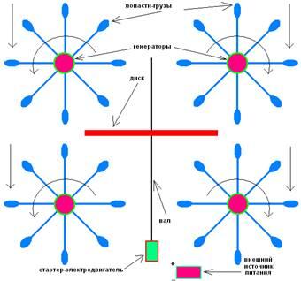 Электродвигателем крайняя область диска разгоняется до угловой скорости 8 км. сек. Диск при этом превращается в антигравитационный зонт, укрывающий одну сторону лопастей-грузов от воздействия упругих продольных волн. Возникающие неуравновешенные силы (прямые стрелки) вращают лопасти-грузы (кривые стрелки). Лопасти-грузы вращают установленные на них генераторы. При наборе генераторами проектной мощности стартер-электродвигатель отключается от внешнего источника питания и подключается к генераторам, вращающимся на лопастях-грузах. При диметре диска 3 м. таких лопастей-грузов может быть установлено как минимум 32 шт. То есть, будет работать 32 генератора. Некоторое количество генераторов будет обеспечивать электрической энергией стартер-электродвигатель. А остальное количество генераторов будет отдавать электроэнергию внешним потребителям. При этом – электроэнергию дармовую, в прямом смысле этого слова. После этого все известные в миру устройства для генерирования электроэнергии (даже перечислять не хочется) переплавят и наделают из них много-много вот таких устройств, которое показано на рис. 5. Так на Земле впервые в истории!!! появится устройство для получения электрической энергии путем преобразования потенциальной энергии гравитационного поля Земли в энергию механическую, с последующим преобразованием механической энергии в энергию электрическую.