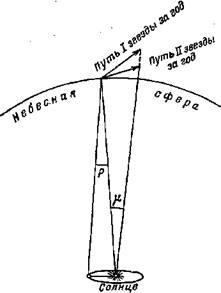 Описанное кажущееся смещение звезды вдвое больше того угла, под которым с нее был бы виден радиус земной орбиты и который называется годичным параллаксом.