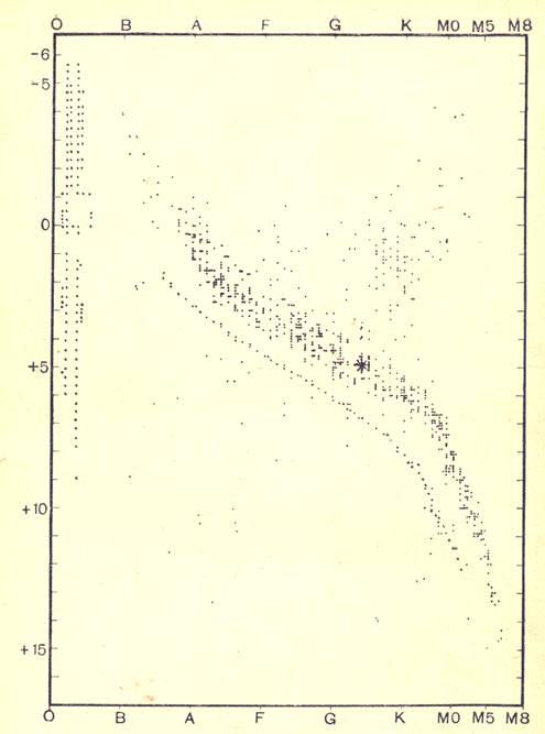 Рассматривая эту диаграмму, мы видим, что звезды разбросаны по ней неравномерно: преобладающее число их расположено по направлению от левого верхнего края, где сосредоточены голубые горячие звезды высокой светимости, к правому нижнему, занимаемому слабосветящимися красными звездами. Это так называемая главная последовательность – включает в себя 90% всех наблюдаемых звезд (в т.ч. и Солнце). Она претерпевает разрыв в области спектрального класса G и делится, на две части. Вторая группа звезд, менее четко выраженная, располагается у спектральных классов G, К и М, немного ниже абсолютной величины 0. Это звезды-гиганты. Выше лежат звезды большой отрицательной абсолютной величиной, т. е. очень яркие звезды – сверхгиганты. Если посмотреть, как распределены звезды класса М, т.е. холодные звезды, то здесь бросается в глаза их неравномерное распределение: среди этих звезд имеются, либо очень яркие звезды-гиганты, либо очень слабые звезды-карлики, а средних по размерам звезд вовсе не имеется.