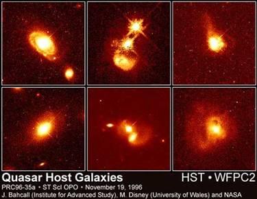 Активные ядра некоторых галактик. Источники, дающие одиночные короткие всплески излучения, по-видимому, связанные с компактными звездами (нейтронными звездами, черными дырами).. |