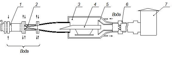 Экспериментальный стенд Т-131Б представляет собой высокотемпературную гиперзвуковую аэродинамическую трубу незамкнутого типа. Принципиальная схема стенда приведена на рис.4. Он состоит из воздухоподогревателя – 1, аэродинамического сопла – 2, рабочей камеры – 3 с установленной в ней моделью ГПВРД – 4, стендового диффузора – 5, газового эжектора – 6 и выхлопной шахты – 7.