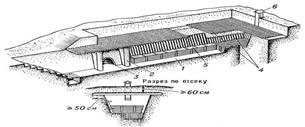 Противорадиационные укрытия (рис. 2) обеспечивают защиту людей главным образом от радиоактивного и светового излучений. В качестве противорадиационных укрытий используются приспособленные и оборудованные для этой цели подвальные и наземные помещения зданий, погреба, подполья, шахты, горные выработки, а также специально построенные противорадиационные укрытия из сборного бетона и железобетона, деревоземляные, из самана, хворостяных фашин и т.п. Защитные свойства противорадиационных укрытий обеспечиваются толщей грунтовой обсыпки, ограждающими конструкциями, герметизацией входов и вентиляционных устройств. В них предусматриваются места для размещения санузлов, запасов воды и продовольствия. Вентиляция противорадиационных укрытий может быть естественной и принудительной. Для подачи воздуха используются вентиляторы с ручным или механическим приводом.