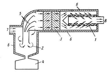 Рис.2.3.11. Схема нейтрализатора выхлопных газов с каталитическим дожиганием: 1 – катализатор; 2 – фильтр грубой очистки; 3 – фильтр тонкой очистки; 4 – масло и топливосборник; 5 – лопатки для выравнивания газового потока; 6 – теплоизоляционный слой; 7 – газы от двигателя; 8 – выход газов в атмосферу