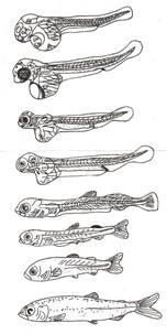 С) при длине 6,2 мм. Крупные пигменты клетки звездчатой формы – меленофоры – в начале единично появляются в передней половине туловища и на ближайших тела участках желточного мешка. В дальнейшем их количество увеличивается и они располагаются вдоль всего тела в 2 ряда по верхнему и нижнему краю сегментов. В тоже время начинается образование зачатка хвостового плавника (происходит скопление мезенхимы в нижней части плавниковой складки). Образование зачатка спинного плавника происходит через 132 дня после оплодотворения икры (средняя температура 10