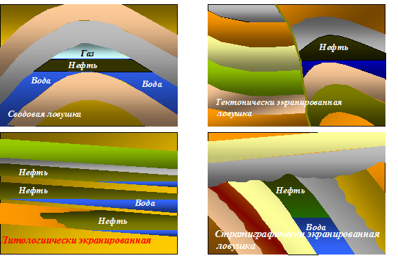 Типы: пластовая, массивная, литологически ограниченная, стратиграфически ограниченная, тектонически экранированная