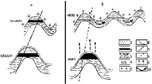 1 – газоконденсат; 2 – нефть; 3 – вода; 4 – плотность углеводородов (г/см?); 5 – непроницаемый флюидоупор; 6 – флюидоупор, проницаемый для легких УВ; 7 – субвертикальный канал струйной миграции УВ; 8 – след субвертикального канала миграции УВ; 9 – направление диффузионно-фильтрационного потока УВ; 10 – направление литеральной миграции УВ.
