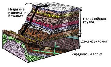 ). Позже эта порода покрылась толстыми слоями осадочной породы. Расположение потоков лавы Базальта Карденас во всей последовательности слоев горных пород в Большом Каньоне можно рассмотреть в общей геологической “блоковой" схеме строения Большого Каньона (Рисунок 4
