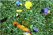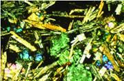 Изображение типичного образца слоя Карденас Базальт под геологическим микроскопом, где видны различные составные минералы, окрашенные в разные цвета.
