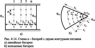 где Li - расстояние между батареями (для i=1 - L1=Lк1 ); ri - радиусы батарей (для i=1 - r0=rк ); ki - число скважин в батареи.