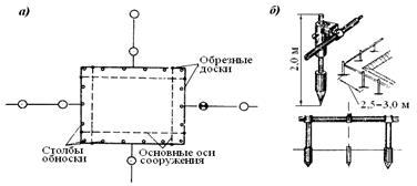 Деревянная обноска (рис. 1, а) состоит из двухметровых столбов, вкапываемых в грунт на глубину 1,0–1,2 м через каждые 2,5–3,0 м по периметру, и обрезных досок толщиной 30–50 мм, прибиваемых к внешней стороне столбов так, чтобы их верхние кромки были в горизонтальной плоскости. Для соблюдения этого условия на столбах предварительно с помощью нивелира намечают точки с одинаковыми высотами. Стороны обноски также должны быть параллельны осям сооружения.