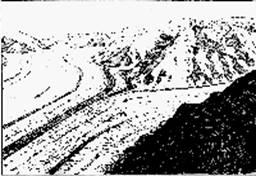 Характерна також неоднакова швидкість руху окремих частин льодовиків [5]. Реперні спостереження в гірських льодовиках показують, що швидкість руху в їхній центральній частині велика, у той час як у бортових і придонних частинах вона зменшується (у результаті тертя). Нерівномірність руху льодовика викликає визначені напруги і виникнення діагональних тріщин (мал. 1.6). У верхнього кінця гірського льодовика утвориться велика крайова тріщина. У перехідній зоні від області харчування до області стоку на підвищеному порозі схилу накопичуються напруги, що розтягують, під дією яких виникають поперечні тріщини (мал. 1.7), що утворяться також при перетинанні нерівностей і виступів підлідного ложа.