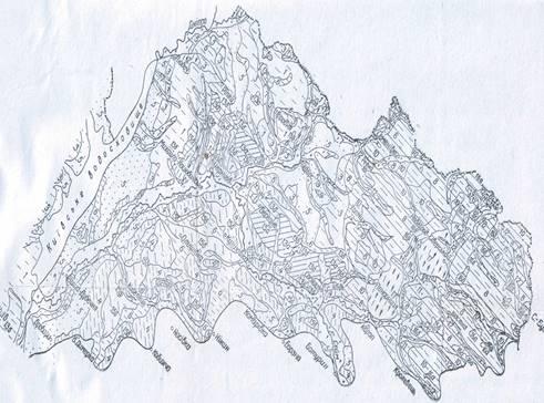 Рис. 1.10. Бічні і кінцеві морени, що облямовують басейн, видовбаний льодовиком у корінних породах оз. Гарда в підніжжя Італійських Альп (по А. Холмсу)