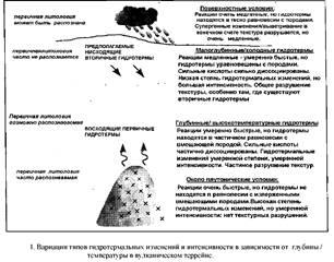 Природа вторичных минералов и скорость их образования контролируются такими факторами, как температура, состав гидротерм и отношение вода/порода. Последний фактор зависит от проницаемости пород, скорости течения гидротерм и продолжительности процесса. Гидротермальные изменения наиболее интенсивны в проницаемых породах, где скорость течения гидротерм большая, и системы долгоживущие. Гидротермальные изменения могут быть описаны с точки зрения их интенсивности, степени изменений и распространенности.