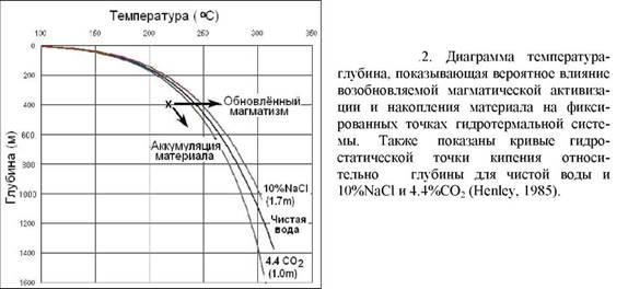 материала и образован большой амфитеатр с крутыми обратными стенками. Блоковое обрушение над гидротермальной системой внезапно уменьшает ограничительное давление в системе, которое может привести к гидротермальному брекчированию, кипению и рудообразованию. Эти эффекты аналогичны эффектам, обусловленным возобновляемым магматизмом, механизм этих процессов разный. Здесь происходит уменьшение ограничительного давления, а не увеличение температуры. Внезапное падение давления может произвести такой же эффект на гидротермальную систему, как и быстрое разогревание, что сопровождается резким снижением точки кипения гидротерм в системе при данных глубинных условиях. Однако в этом случае температура будет понижаться, а не повышаться, приводя к ретроградному наложению. Наоборот, обрушение кальдер, по-видимому, может привести к прогрессивному наложению.