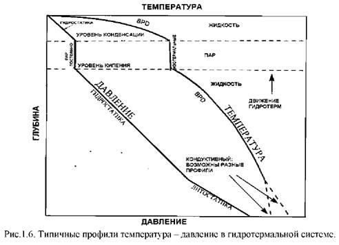 Температурный градиент на больших глубинах - кондуктивный. Выше этого уровня в пределах конвективной зоны температурный градиент контролируется давлением, поскольку он ограничен точкой кипения воды при разных давлениях.