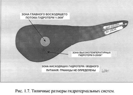 Размеры типичной гидротермальной системы зависят от геологии и топографии. Этот вопрос будет обсуждаться в деталях позже. Исходя из общих структурных позиций, площадь зоны восходящих гидротерм может колебаться в пределах 1-3 км2