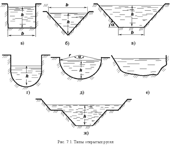 (рис. 7.1, г, д). Правильную форму чаще всего имеют искусственные русла. К руслам неправильной формы относятся полигональные (составные) русла (рис. 7.1, ж) и русла естественных потоков (рис. 7.1, е).