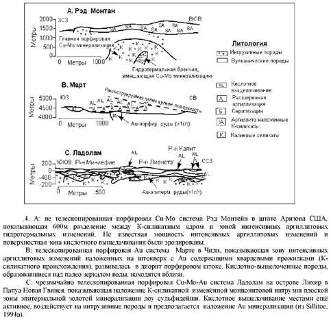 Степень эрозии во время жизнедеятельности гидротермальной системы может быть значительной, особенно в островодужных структурах. Тектонизм, оказывающий влияние на вулканическую деятельность, также может усилить или уменьшить эти эффекты. Но, обычно, влияние будет проявляться в сдвиге изотерм во времени, что касается пород и в типе процесса конвейер-поясов(?). Это вновь будет приводить к наложению зон гидротермальных изменений, очевидно ретроградного вида, поскольку температура на поверхности не может превышать 100°С в стабильной ситуации. Примеры разнообразия систем с небольшой эрозией и наложениями и систем с интенсивной эрозией и наложениями приведены Sillitoe (1994a) (рис.6 4).