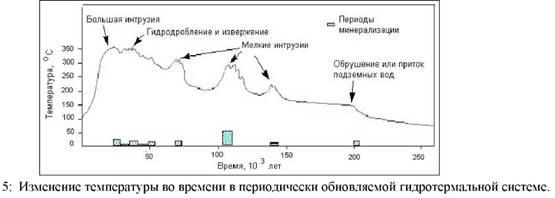Напрашивается вывод, что тепловой поток, формирующий системы, изменялся во времени. Таким образом, модели с установившимся режимом теплового питания гидротермальных систем, какие используют геотермальные резервуарные инженеры, не приемлемы для долгоживущих гидротермальных систем. В связи с этим это имеет значение при изменении физико-химических условий рудной минерализации и, вероятно, такие периоды изменений здесь более важны, чем периоды с установившимися режимами активности.