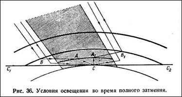 Наблюдатель, находящийся в точке С внутри конуса лунной тени, получает свет от слоев воздуха АА1, которые, в свою очередь, получают его от слоев ВВ1, освещаемых Солнцем. Нетрудно заметить, что и часть слоев ВВ1, расположенная выше горизонта наблюдателя С1СС2, будет посылать свет в сторону наблюдателя, что создаст яркое кольцо у горизонта (так называемое заревое кольцо). Понятно, что чем шире конус лунной тени, тем более высокие слои атмосферы будут создавать явление заревого кольца. А так как рассеивающая способность воздуха убывает с высотой, яркость заревого кольца будет также убывать с увеличением расстояния его от наблюдателя. Так как во время затмения лунная тень быстро скользит по земной поверхности, расстояние от наблюдателя до любой точки заревого кольца меняется, и поэтому наблюдения заревого кольца могут дать некоторые сведения о рассеивающей способности воздуха на различной высоте.