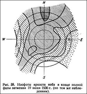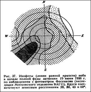 Как показали фотометрические наблюдения во время солнечных затмений 1936, 1941, 1945 и 1952 гг., распределение яркости по небу за время полной фазы значительно изменяется, отражая перемещение лунной тени относительно наблюдателя. Для примера приводим рис. 2 и 3, на которых изображены изофоты (линии равной яркости) неба в начале и в конце полного затмения 19 июня 1936 г. по данным экспедиции Московского отделения ВАГО. Лунная тень перемещалась тогда с юго-запада на северо-восток.