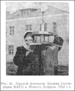 Фотометр укладывается горизонтально на деревянные подставки и укрепляется на доске, причём его установка выверяется по отвесу и уровню. Кольцевой полуцилиндр и оси трубок располагаются в одном вертикале. Необ ходимо, конечно, заранее рассчитать азимут Солнца для середины полной фазы затмения, и в этом вертикале установить фотометр. Поскольку полная фаза затмения весьма непродолжительна (2—3 минуты), то не имеет смысла поворачивать фотометр по азимуту за Солнцем, так как за время продолжительности полной фазы суточное смещение Солнца не превосходит 0°,5, что лежит в пределах диаметра площадки неба, охватываемой каждой трубкой. За время полной фазы с этим фотометром можно сделать 10—12 экспозиций (по 5 сек. каждая). Фотометрию в вертикале Солнца тоже весьма желательно провести с различными фильтрами, для чего нужно иметь несколько вертикальных фотометров. Экспозиции для каждого фильтра нужно подбирать отдельно, как рассказано выше. Зарядка этого фотометра производится в полной темноте, совершенно так же, как и зарядка заревого фотометра.