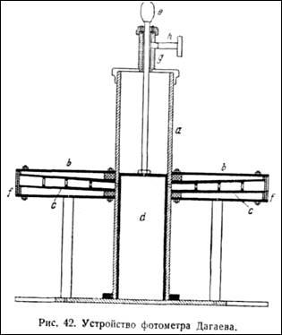 От этого недостатка свободен усовершенствованный фотометр Фесенкова (рис. 4, Б), который состоит из полой металлической полусферы, точнее, сферического сегмента а, укреплённого на металлическом кольце b, которое установлено на эбонитовый круг с. Трубки dрасположены между сферическим сегментом а и эбонитовым кругом с (что обеспечивает прочность прибора и предохраняет от случайных поломок).